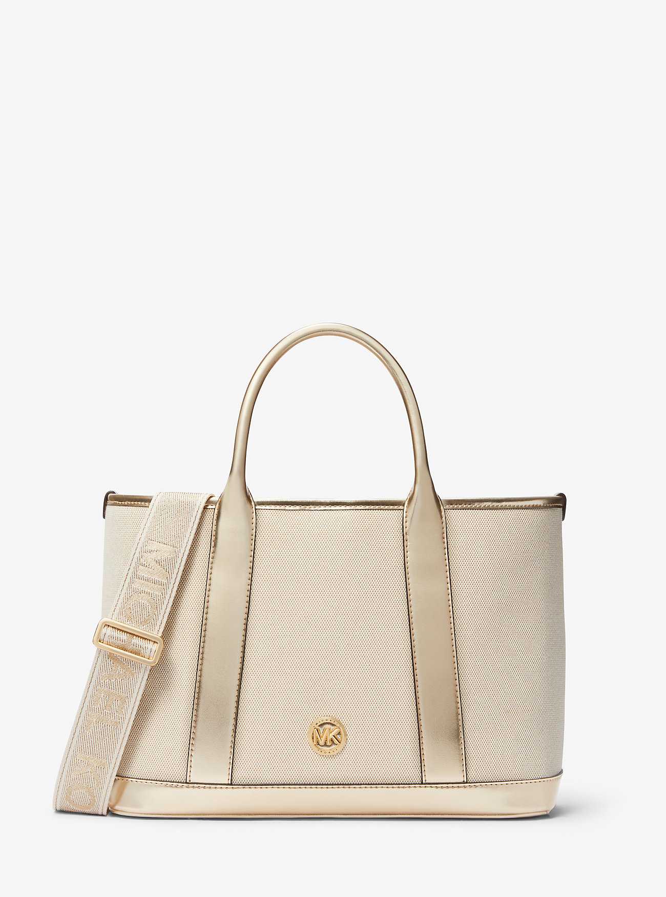 The Luisa satchel is an instant favorite—it’s simple, timeless and a perfect everyday companion. Made from textured cotton-canvas with metallic trim, it boasts a rectangular shape that can comfortably fit your phone, wallet and tablet. Carry it by the top handles or over the shoulder by its logo-webbing strap.