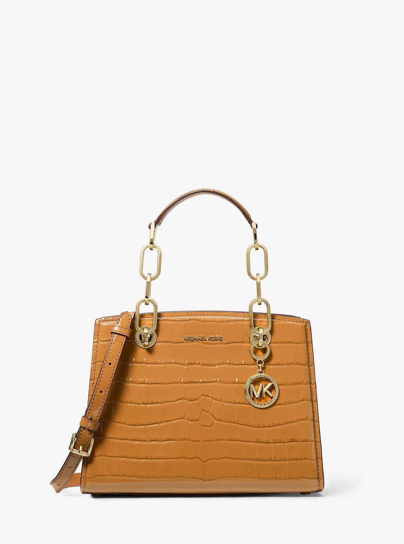 Our crocodile-embossed leather Cynthia satchel is equal parts chic and pragmatic. Chain-trimmed top handles and touches of polished hardware add to its feminine charm, while a petite, compartmented interior keeps your necessities safe and organized. Wear it crossbody on days that call for an easier attitude.