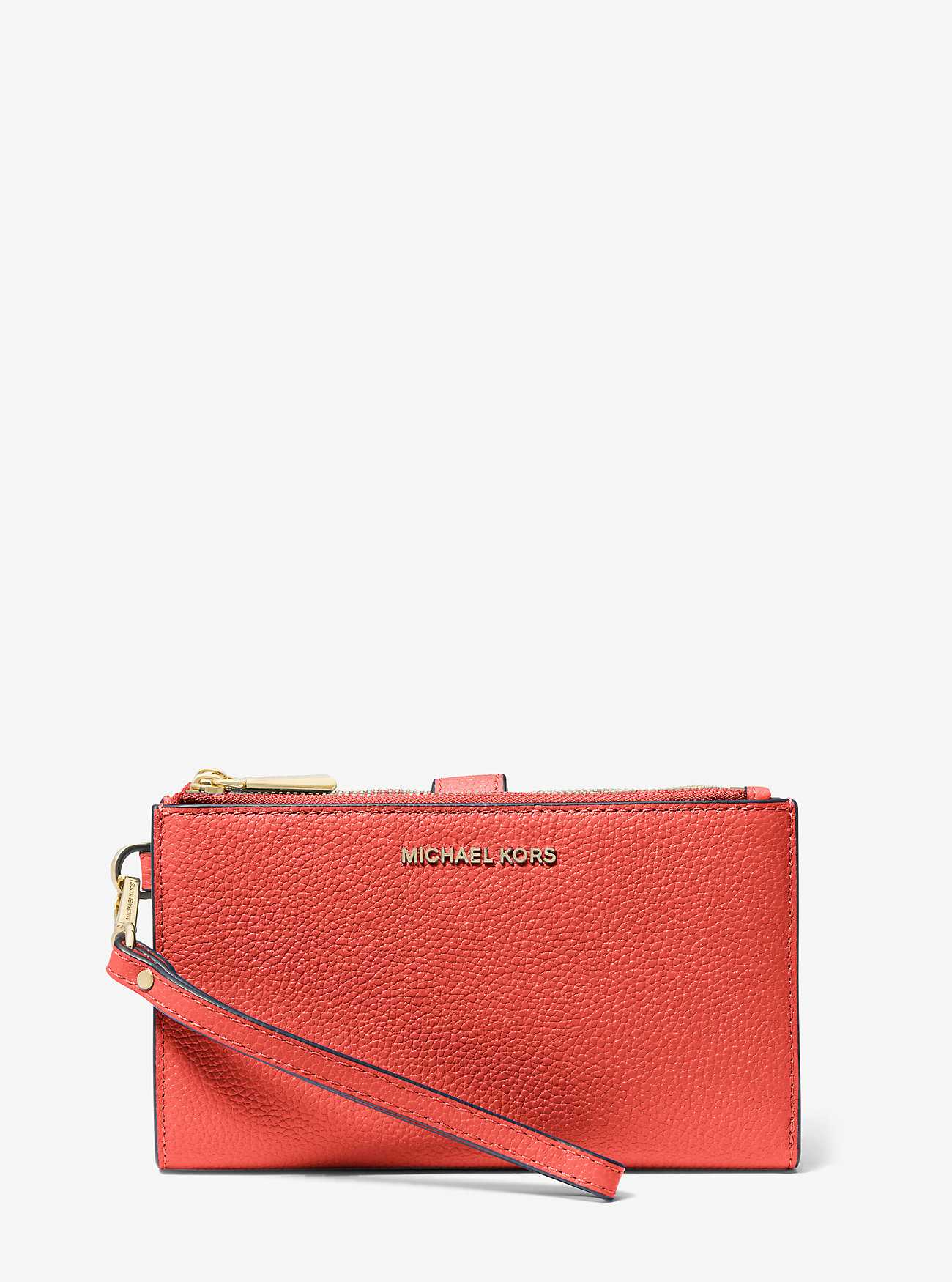 Done in a rich pebbled leather for timeless status, this sleek wallet has two zip sides that unfold to reveal a center with pockets for all the essentials, from credit cards to your smartphone. A wristlet strap perfects its versatility factor, so it can be carried alone or in a tote.