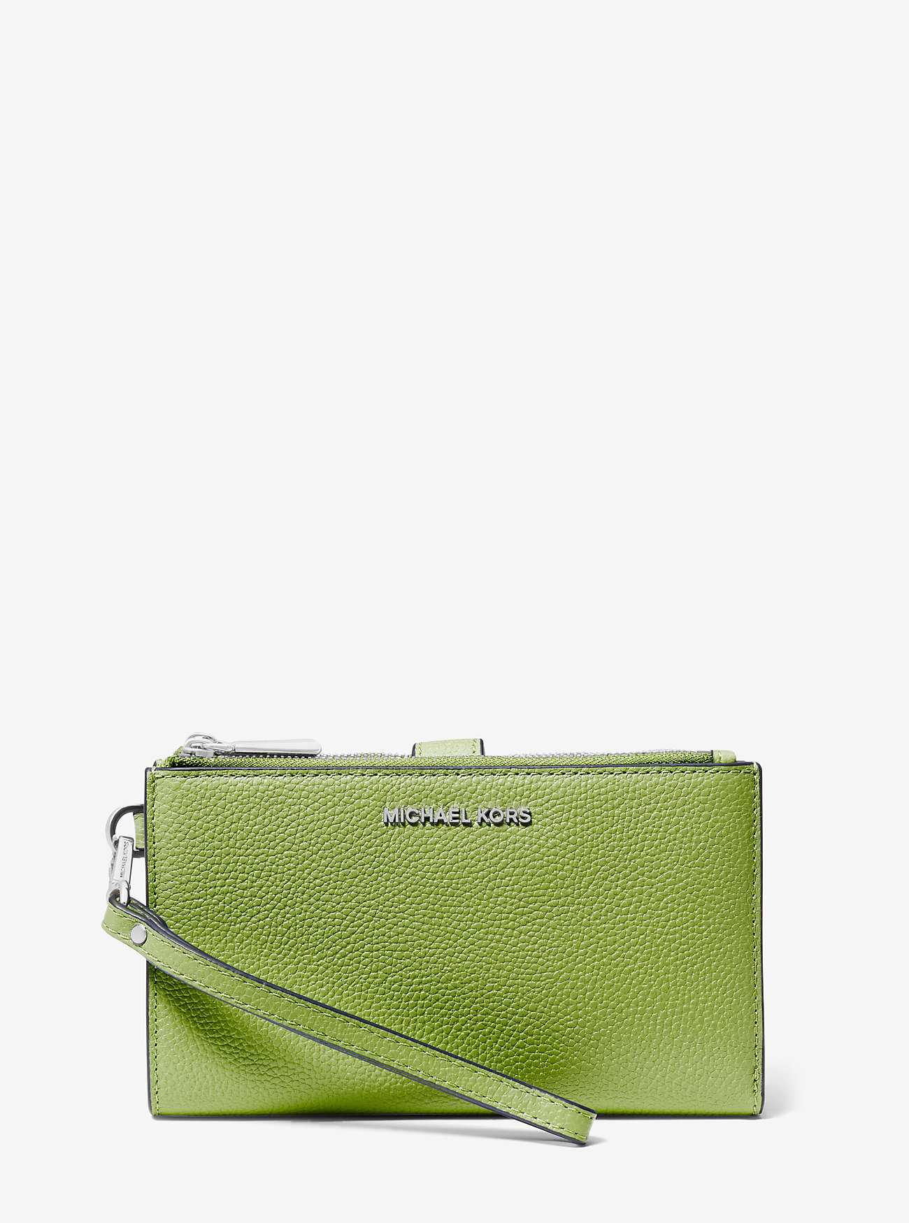 Done in a rich pebbled leather for timeless status, this sleek wallet has two zip sides that unfold to reveal a center with pockets for all the essentials, from credit cards to your smartphone. A wristlet strap perfects its versatility factor, so it can be carried alone or in a tote.