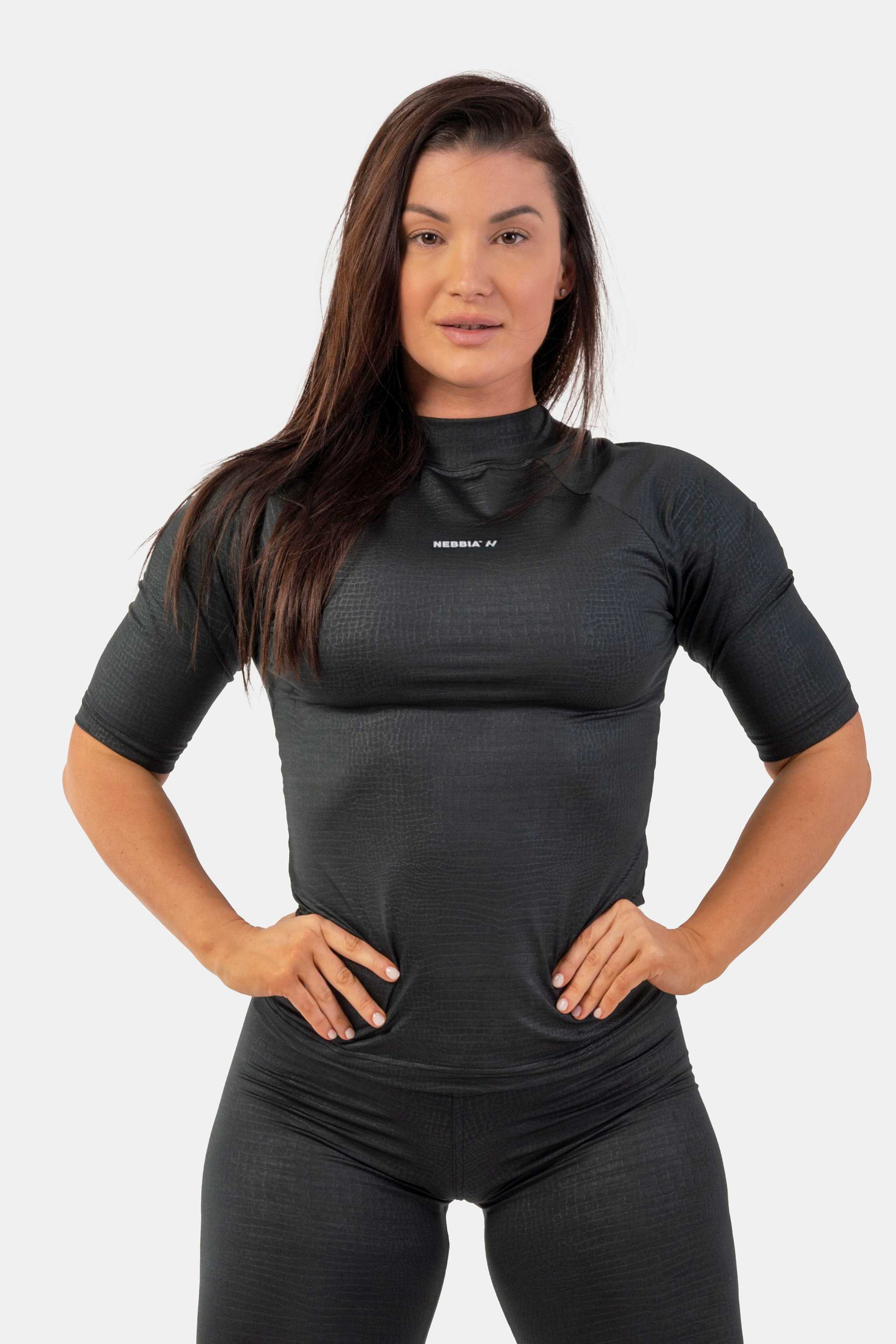 The black Phyton T-shirt for women is perfect for all kinds of sports, it’s also an ideal piece for your athleisure city outfits. Enjoy its functional properties such as the sweat-wicking technology, elasticity, and resistance to everyday wear. If you want to underline your femininity during all your activities this slim fit T-shirt with snakeskin pattern and a turtleneck detailing is for you! It pairs perfectly with the Python leggings, but you can also wear it with your favorite pair of jeans, a skirt, or the Bubble Butt leggings from NEBBIA.