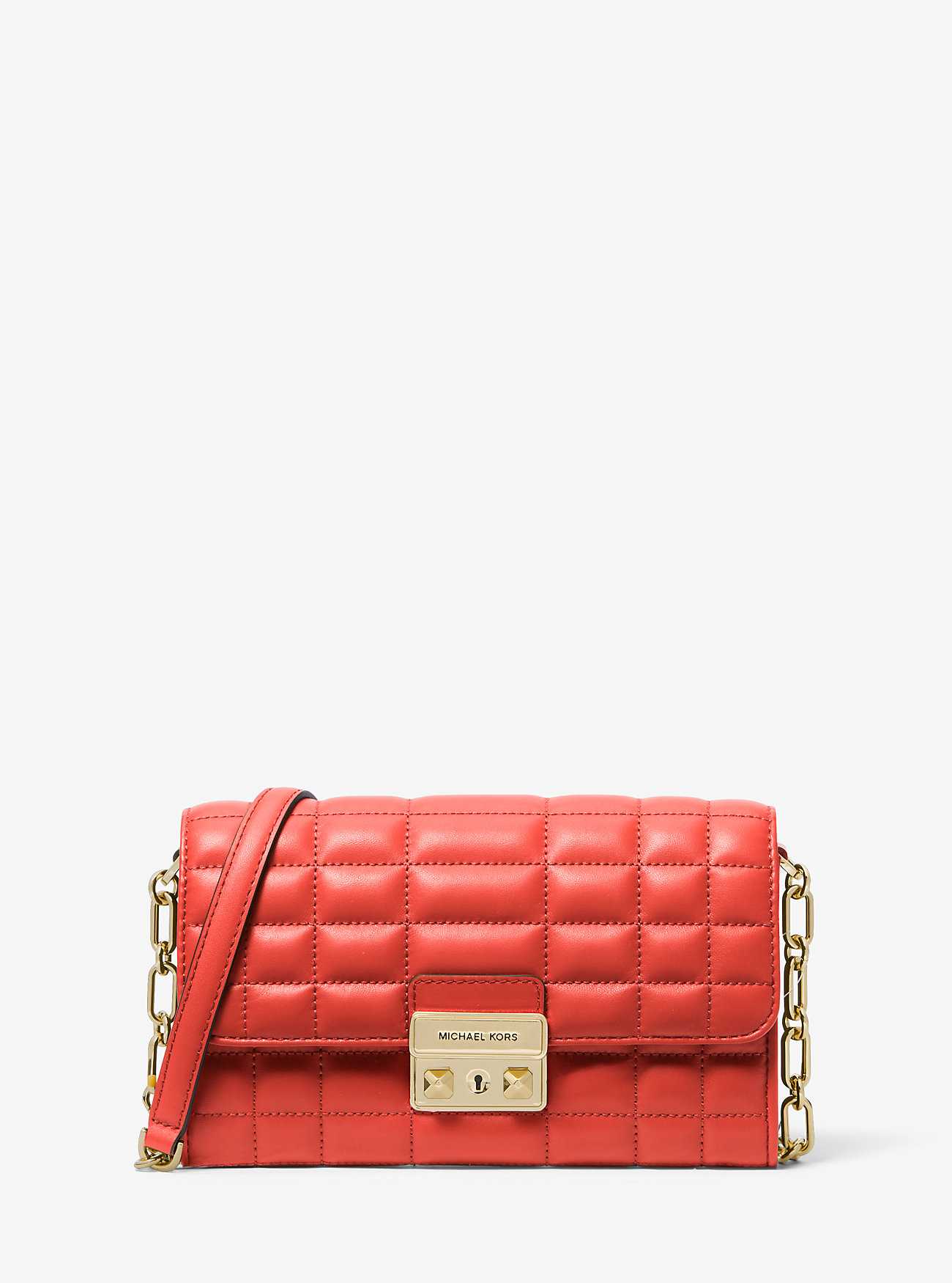 Our newest addition to the Tribeca family reads equally sleek and eye-catching. Made from supple leather with a quilted finish, it’s designed in a slim profile and features a detachable chain-link strap for added styling options. The pocketed interior will safely hold a card case, lipstick and keys.