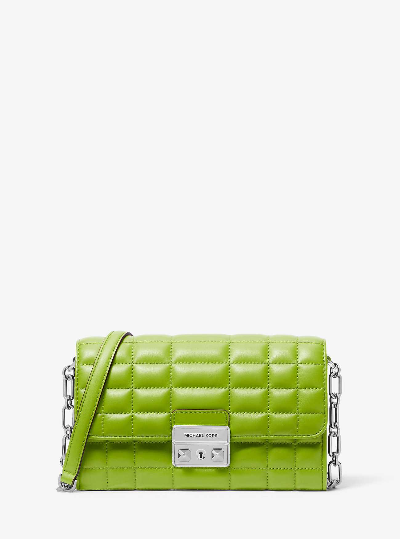Our newest addition to the Tribeca family is equally sleek and eye-catching. Made from supple leather with a quilted finish, it’s designed in a slim profile and features a detachable chain-link strap for added styling options. The pocketed interior will safely hold a card case, lipstick and keys.