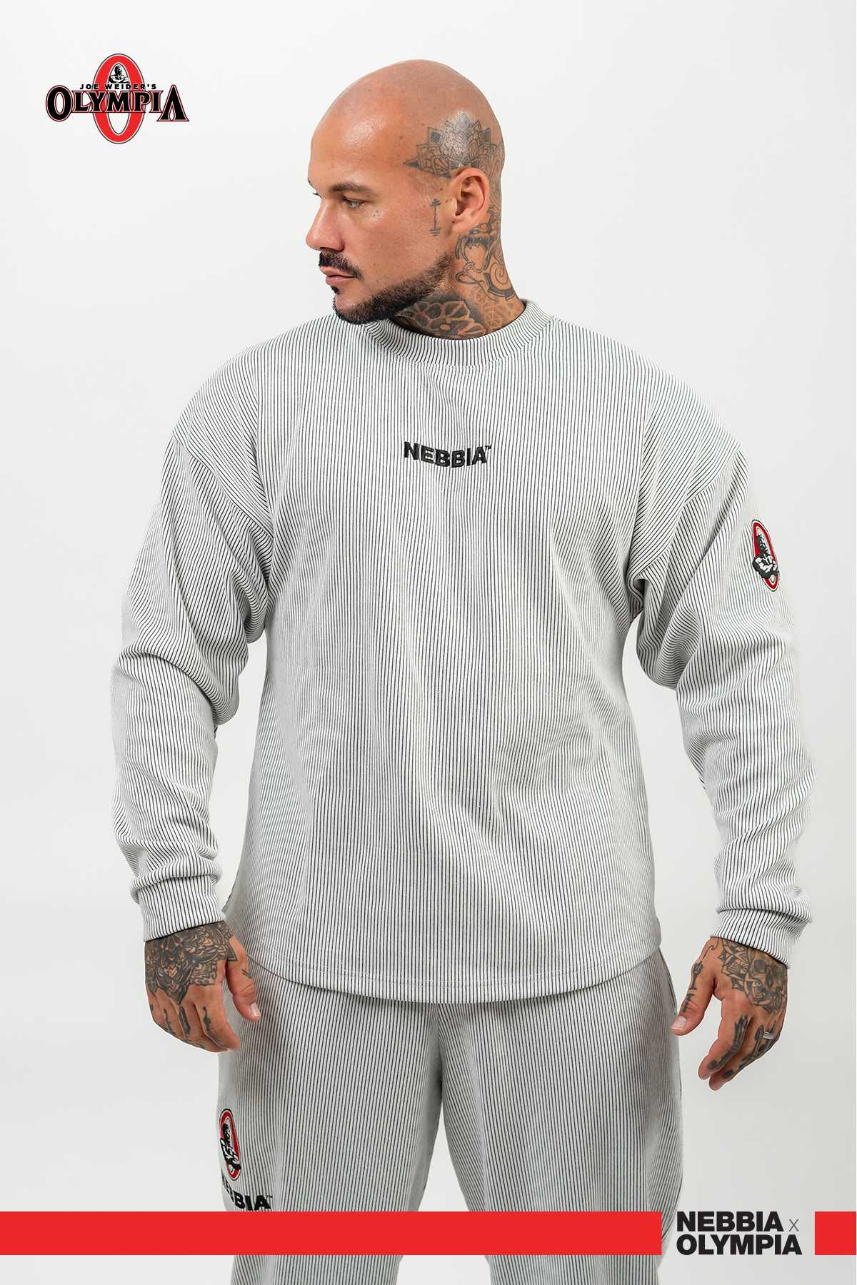A sweatshirt with a scalloped corduroy-like pattern will keep you warm and make you stand out from the crowd. Thanks to its looser cut, it will fit even if you are more muscular. Combining retro elements with modern style, you’ll be wearing a piece of bodybuilding history. The NEBBIA and Mr. Olympia logos stand out on the white and grey oversized sweatshirt. Thanks to them, you’ll make it obvious what crew you belong to!