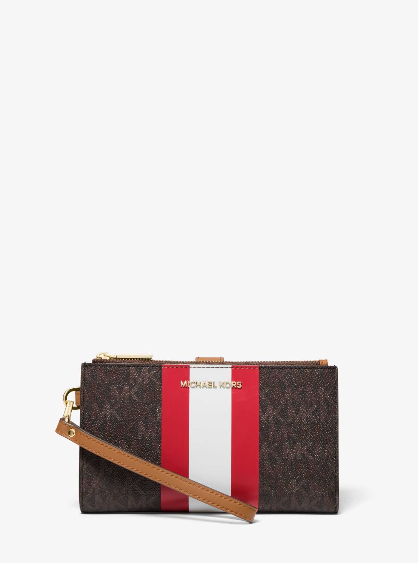 Crafted from Signature-print canvas accented with a sporty center stripe, this wallet has two zip sides that unfold to reveal a center with pockets for all the essentials—from credit cards to your smartphone. A detachable wristlet strap makes it versatile enough to carry alone or in a tote.
